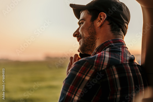 A young man seated comfortably in the back of a truck, talking on his phone as the sun sets in the background