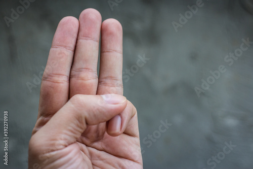 A young man showing his hands holding three fingers on a gray background.