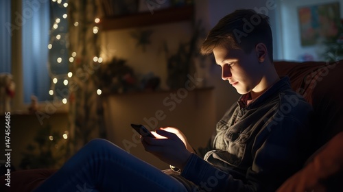 A young man sitting on a couch, engrossed in his smartphone, with a Christmas tree in the background.