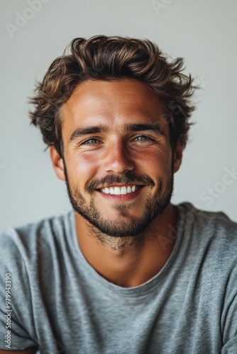 A young man smiles brightly, showcasing his cheerful demeanor while dressed casually in gray