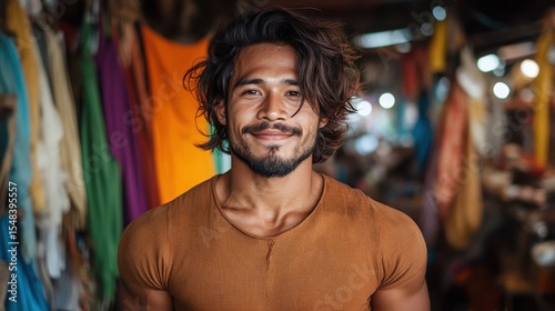 A young man stands confidently with a warm smile in a vibrant market filled with colorful fabrics, showcasing the essence of cultural beauty and connection to surroundings.