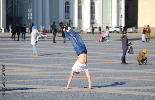 A young man stands on his hands, Palace square, Saint Petersburg, Russia, March 2020