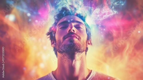 A young man stands with his eyes closed, enjoying a moment of tranquility. Colors swirl around him, depicting a sense of creativity and inspiration during the evening.