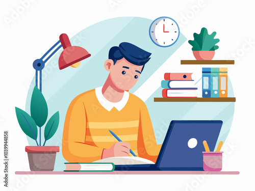 A young man studies diligently at his laptop in a cozy workspace with books, plants, and warm lighting during the afternoon