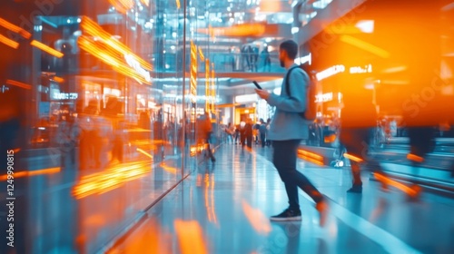A young man walks through a busy shopping mall, using his phone. Bright orange and teal color scheme.
