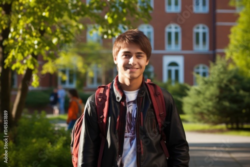A young man wearing a red jacket and a backpack is smiling for the camera