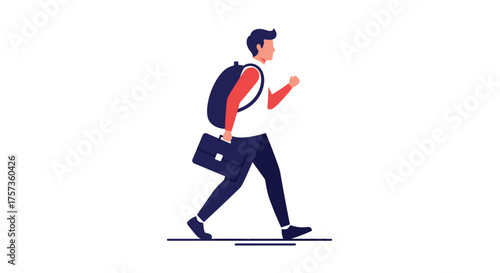 A young man with a backpack and briefcase walks purposefully across a white background.