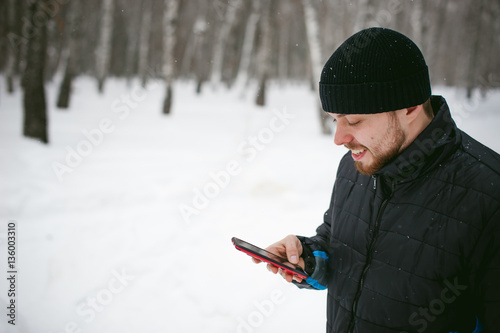 a young man with a beard, smokes an electronic cigarette and happily talking on the phone through the Internet, a positive relaxing outdoors in the snow in the winter