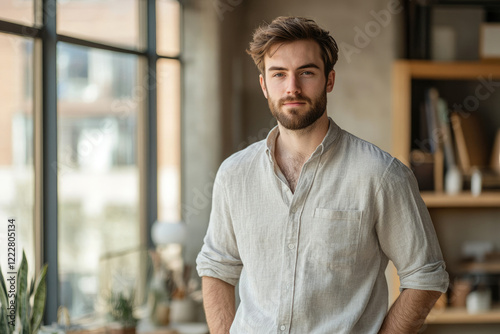 A young man with a beard, wearing a light beige shirt, stands confidently near a window in a well-lit room.