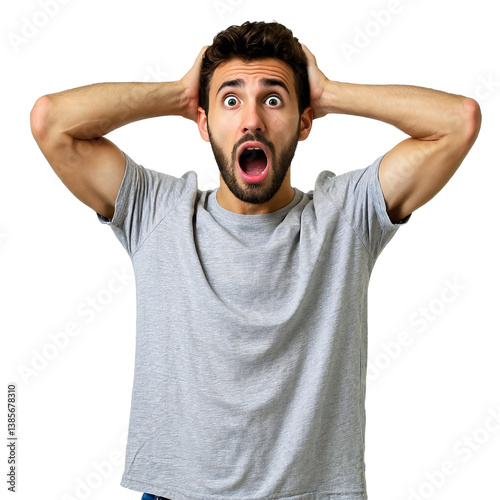 a young man with a shocked expression and hands raised to his head appears distressed against a plain white background.