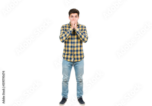 A young man with brown hair and blue eyes, wearing a plaid shirt and jeans, covering his mouth with his hands in shock isolated on a transparent background