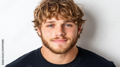 A young man with curly hair and a beard displays a warm smile. He wears a black shirt, standing against a plain white background that highlights his friendly expression
