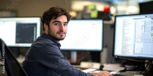 A young man works intently at his computer desk. He is focused on his screen with code visible. The modern office environment enhances productivity and creativity. AI