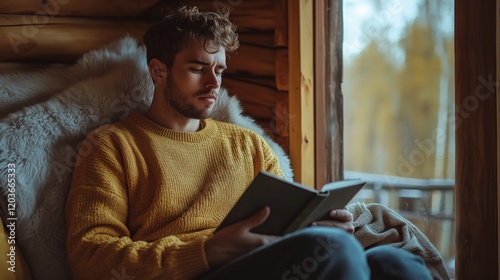 A young man, wrapped in a warm sweater, sits by the window of a cozy log cabin, immersed in his book as the electric heater hums softly nearby, creating a tranquil winter retreat.