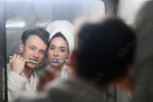 a young married couple brushing their teeth together. Dental hygiene.