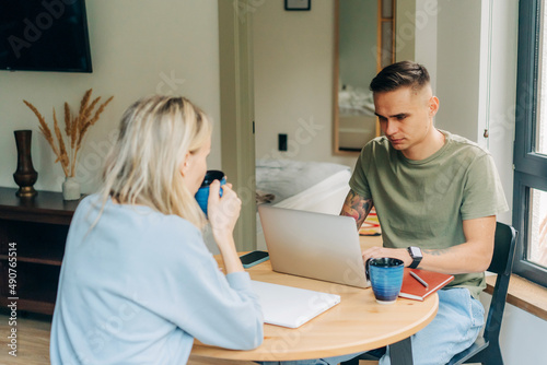 A young married couple uses a laptop at breakfast and drinks coffee.