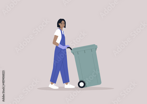 A young modern character in denim overalls collecting a waste bin, Utility service, environmental conversation, a plastic garbage container on a wheel
