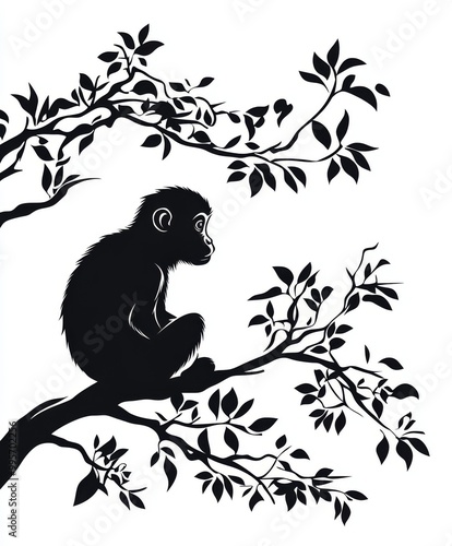 A Young Monkey Sitting Quietly on a Tree Branch Surrounded by Leaves During Daylight