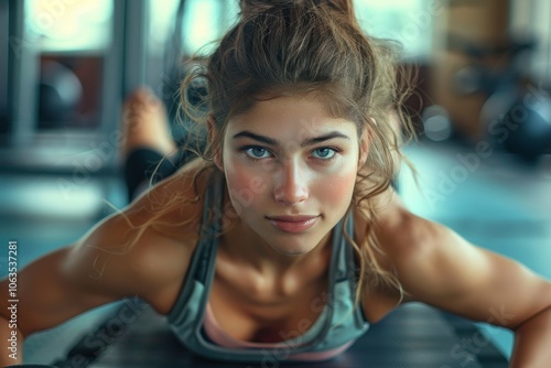 A young, muscular woman focuses intensely while performing a core exercise in a gym setting. Her hair is tied up, and she appears determined.