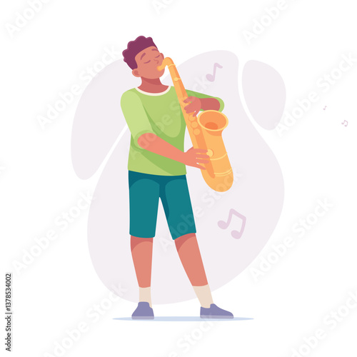 A Young Musician Enthusiastically Playing the Saxophone on Stage with Joyful Energy