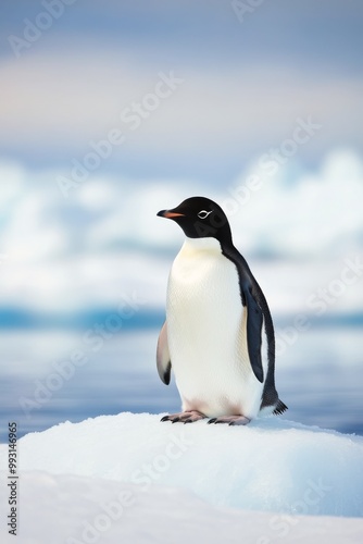 A young penguin stands proudly on a snowy landscape in Antarctica during the winter season