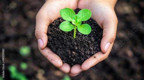 A young person gently cradles a small green plant in dark, nutrient-rich soil, showcasing care and hope for growth in a vibrant backyard garden