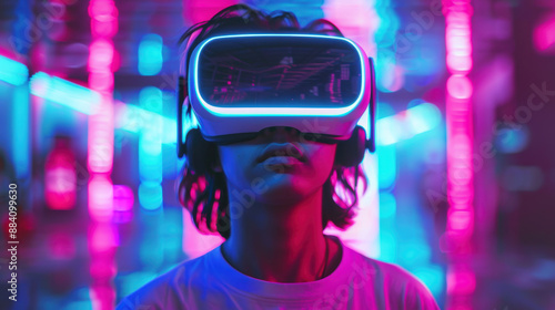A young person immersed in virtual reality, wearing a VR headset with neon pink and blue lights in the background, exploring digital worlds with futuristic technology.