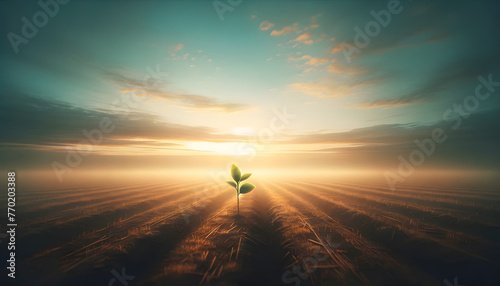A young plant sprouting on a farm field, with the dawn's light spreading across the horizon.