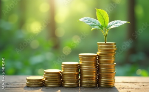A young plant sprouts from a stack of golden coins, representing financial growth and investment.