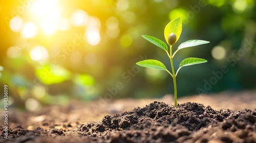 A young plant sprouts from rich soil, basking in warm sunlight, symbolizing growth and renewal in a natural environment.