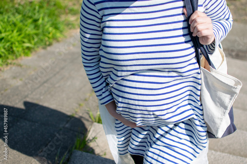 A young pregnant Asian woman climbing the stairs with totebag for picnic