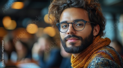 A young professional engages with colleagues in a modern office environment during the afternoon
