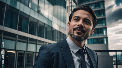 A young professional man is standing in the city looking thoughtful. He is wearing a suit and tie and has a beard. The background is a modern cityscape with skyscrapers and glass buildings.