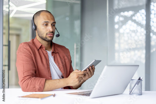 A young professional man is using a smartphone and laptop at his desk, wearing a headset. The scene suggests a remote work environment, highlighting technology use and communication.