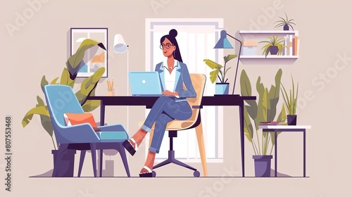 A young professional woman sits at her desk, working on her laptop