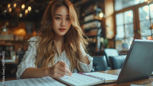 A young professional woman working on a tablet in a cozy, well-lit office space with a warm and focused ambiance.