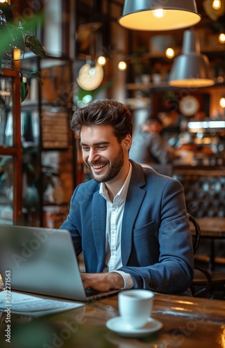 A young professional works on his laptop in a cafe, smiling at the screen, holding a coffee cup