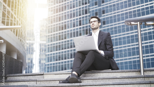 A young serious businessman in eyeglasses dressed in suit sitting on the stairs working holding a laptop outside downtown