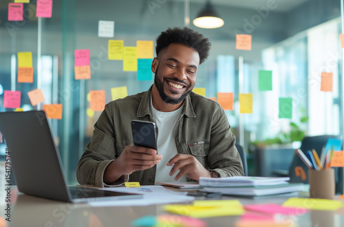 A young Smiling businessman in a modern office, holding a smartphone, sitting at a desk with a laptop, colorful sticky notes covering a dark blue glass wall behind him, creative and productive