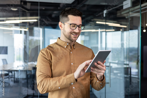 A young smiling male businessman in glasses is standing in the office and using a tablet. typing, chatting, searching for information