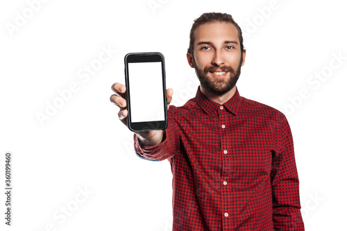 A young smiling man shows a smartphone screen on a white background. Isolate Place for advertising and advertising labels.