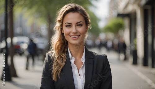 A young smiling professional businesswoman standing outdoors, a pretty, female entrepreneur