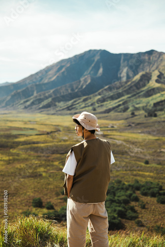 A young Southeast Asian male hiker is looking away in the green hills