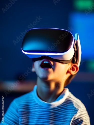 A young student wearing a VR headset, immersed in the exciting world of virtual reality, exploring new technologies and engaging with digital content.
