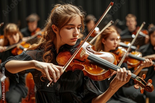 A young violinist performs passionately during an orchestral concert in a grand hall filled with musicians