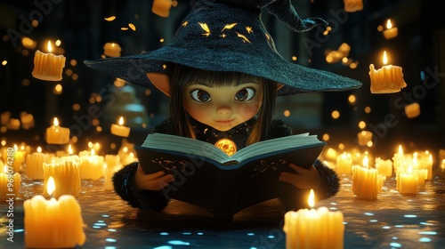 A Young Witch Reads a Spell Book in a Candlelit Room