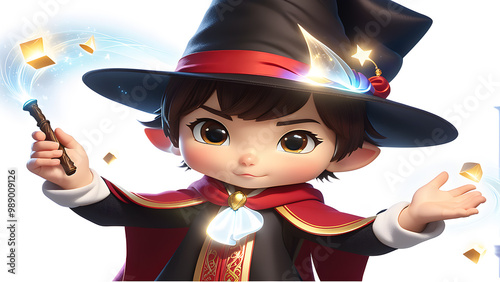 A young wizard in a black hat with a red band casts a spell with a glowing wand and summons golden geometric shapes.