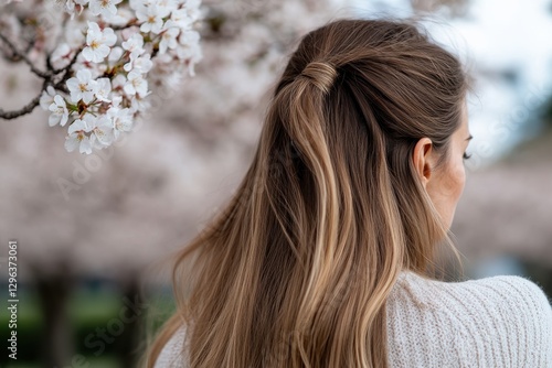 A young woman admires beautiful cherry blossoms, capturing the joy and tranquility that nature provides, evoking a sense of peace and connection with the environment.
