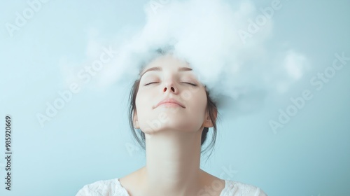 A young woman appears calm and peaceful, her head surrounded by soft clouds, lost in thought against a light blue backdrop, embodying tranquility