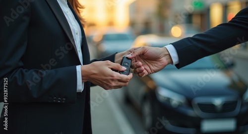 A young woman at a dealership transfers the keys of a vehicle to a customer, who is either buying or renting the car. The dealership offers sales, purchases, and rentals.